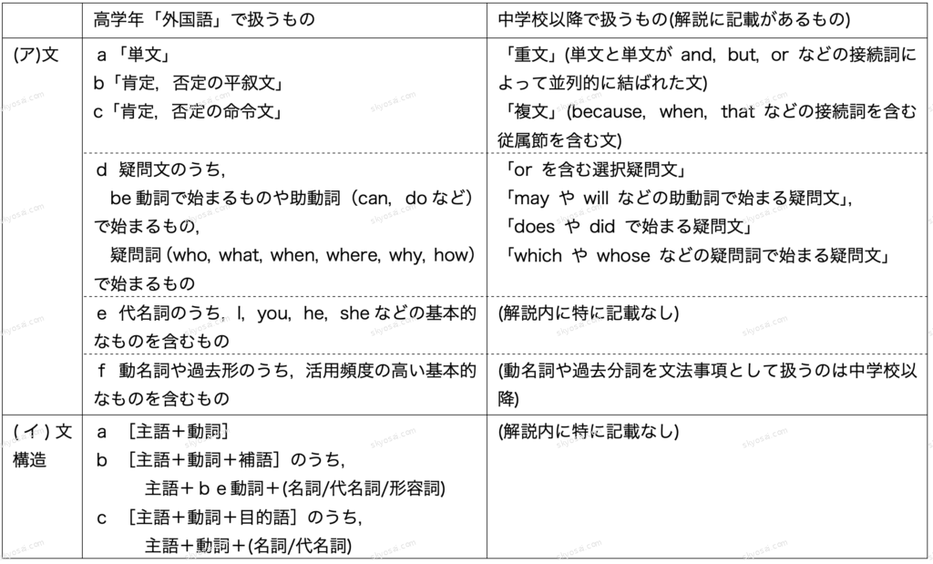 ◯高学年「外国語」で扱う「文及び文構」(本文及び解説)