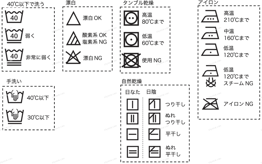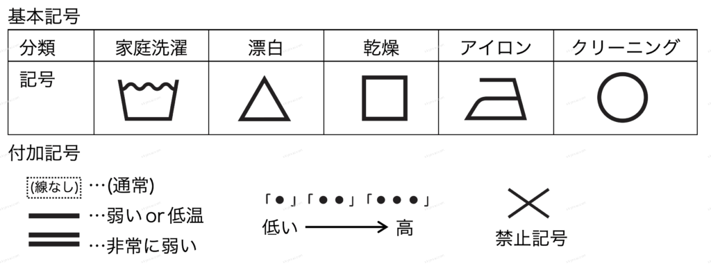 ※2024年8月のJIS規格改正により、アイロン上限温度が高温200℃→210℃、中温150℃→160℃、低温110℃→120℃とそれぞれ変更されている。