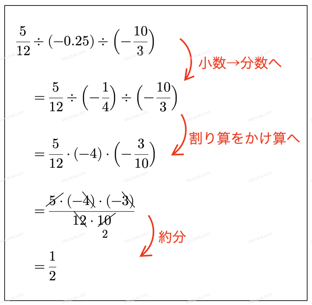 分数の除算割る数の逆数(分母と分子を入れ替えた数)を掛ける\( \displaystyle \frac{1}{2} \div \frac{3}{4} = \frac{1}{2} \cdot \frac{4}{3} = \frac{4}{6} = \frac{2}{3} \)
