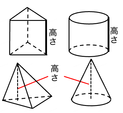 \( \displaystyle V = \frac{1}{3} \cdot (\text{底面積}) \cdot (\text{高さ}) \)