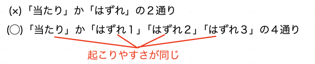 ※(①について)どの事柄の起こりやすさも同じになるように、同じものでも区別したり、細かく分解したりして考える。