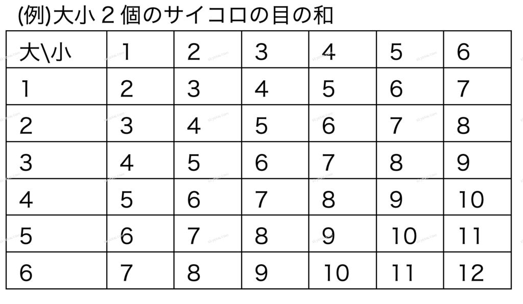 とくに、大小2個のサイコロを投げたときの和・差・積が問われることが多い。
