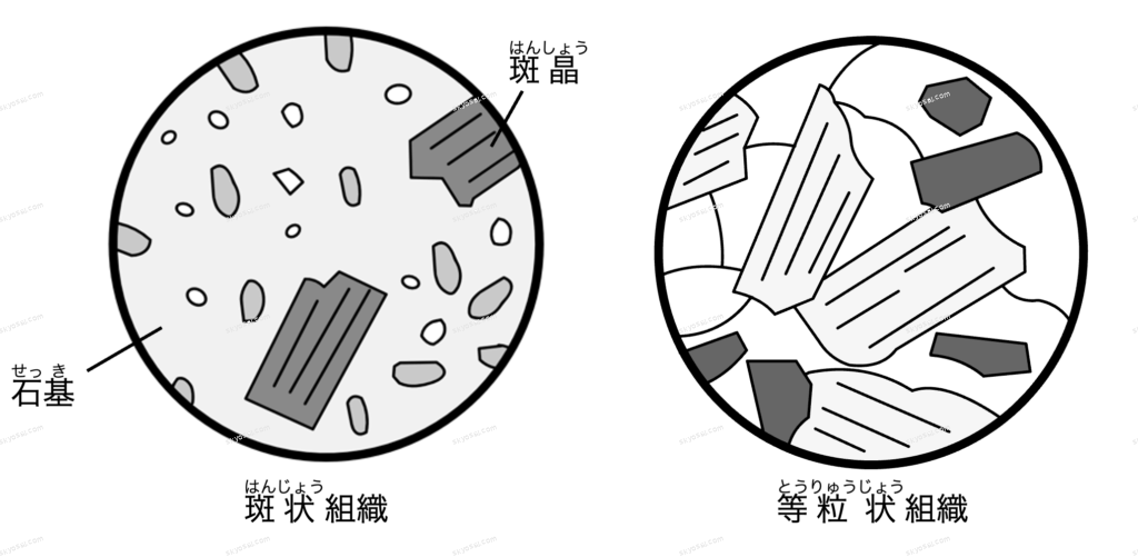 火山岩地表や地表近く急に冷える斑状はんじょう組織大きな結晶(斑晶はんしょう)が、小さな粒やガラス質(石基せっき)の中に散らばる