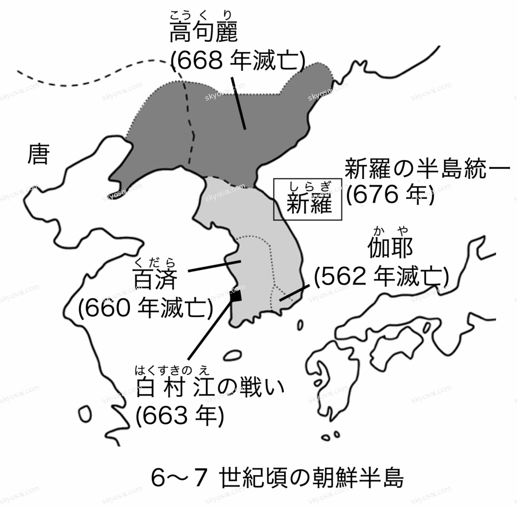 | 背景:百済の滅亡 結果:倭(日本)が唐・ 新羅 の連合軍に大敗 影響:九州北部に大野城や水城など国防施設を設置 |