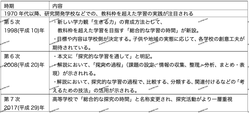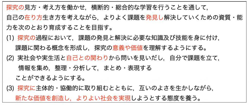 TOP > 教職教養 一覧 [教採スタンダード] > 総合的な学習の時間・特別活動 参考書モード 講義モード(準備中) ◯「総合的な学習の時間」の流れ ◯(小・中学校)総合的な学習の時間の目標 ◯(高等学校)総合的な探究の時間の目標 (差分は赤字。「探究的」が「探究」に、全体的に記述が高度化) ◯特別活動・目標 解説ー準備中 この記事は役に立ちましたか? 間違い/不具合かな?と思ったらこちらへ ✉️ 修正を提案する 2026年2月9日 author