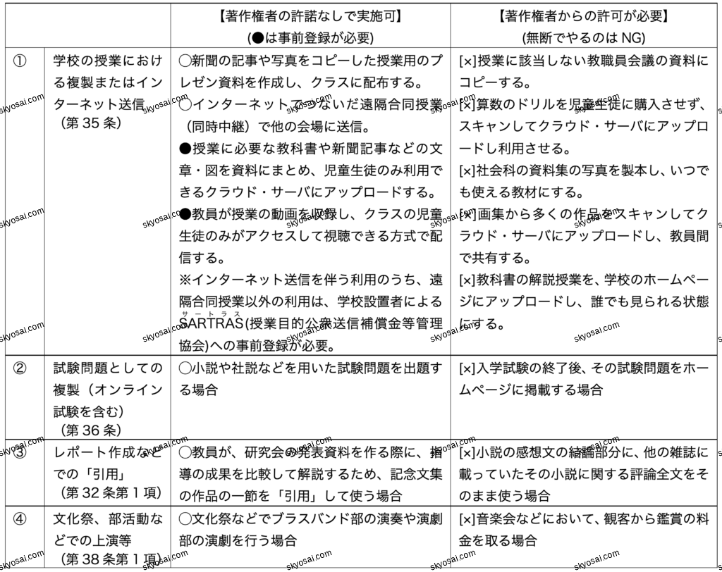 TOP > 教職教養 一覧 [教採スタンダード] > 情報化・デジタル教科書・著作権 参考書モード 講義モード(準備中) ◯情報活用能力 「情報活用能力」は,世の中の様々な事象を情報とその結び付きとして捉え,情報及び情報技術を適切かつ効果的に活用して,問題を発見・解決したり自分の考えを形成したりしていくために必要な資質・能力である。教育の情報化に関する手引[追補版]、令和2年文部科学省 より ◯学校教育の情報化の推進に関する法律 ◯教科書の歴史 ◯各種教材の扱い ◯著作権 ・著作権が関係する、学校での場面例 学校における教育活動と著作権(令和5年度改訂版、文化庁)より作成 解説ー準備中 この記事は役に立ちましたか? 間違い/不具合かな?と思ったらこちらへ ✉️ 修正を提案する 2026年2月9日 author