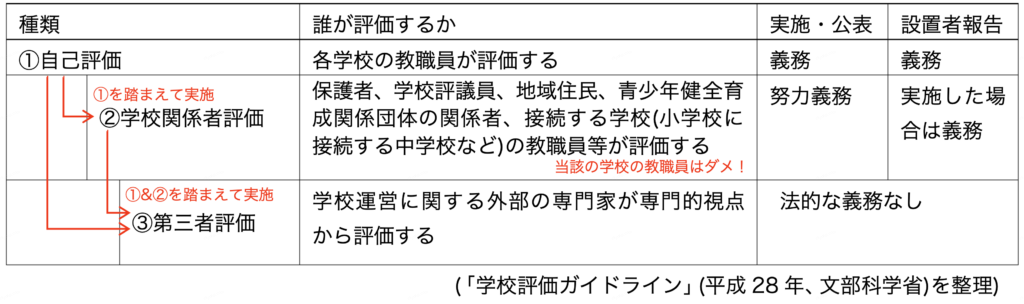 ①組織的・継続的な改善各学校が、自らの教育活動その他の学校運営について、目指すべき目標を設定し、その達成状況や達成に向けた取組の適切さ等について評価することにより、学校として 組織的・継続的 な改善を図ること。